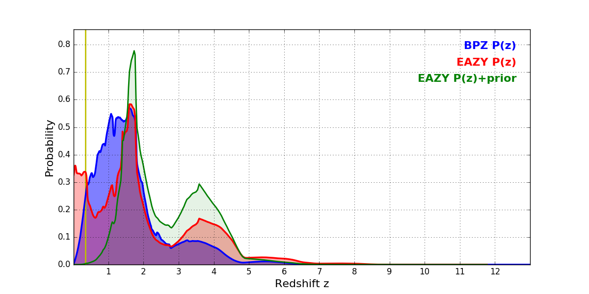 In P(z) plots: Yellow lines mark the cluster redshift z = 0.341,