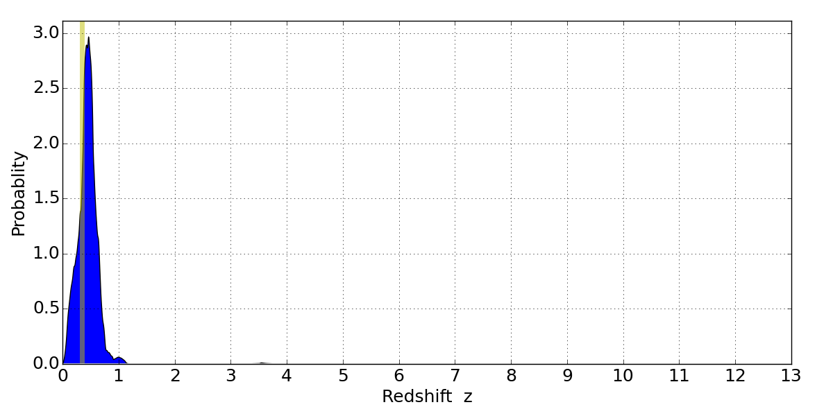 In P(z) plots: Yellow lines mark the cluster redshift z = 0.341,