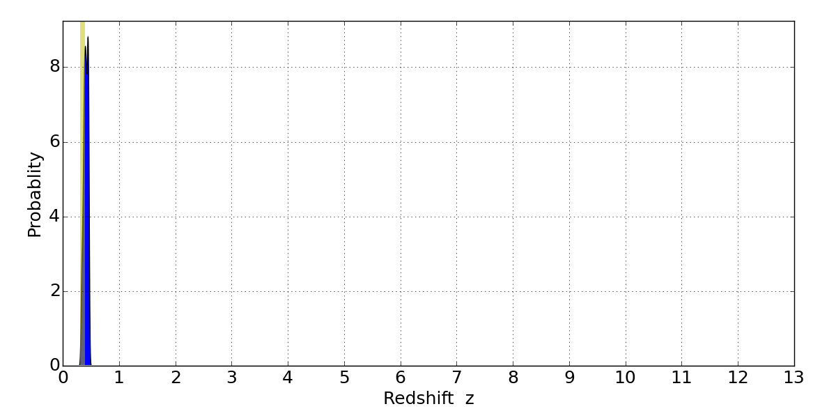 In P(z) plots: Yellow lines mark the cluster redshift z = 0.341,