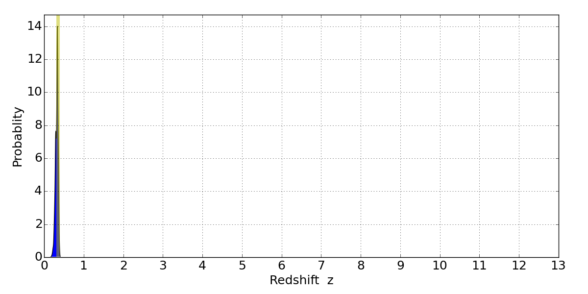 In P(z) plots: Yellow lines mark the cluster redshift z = 0.341,