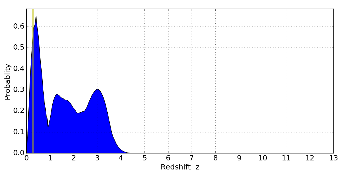 In P(z) plots: Yellow lines mark the cluster redshift z = 0.284,