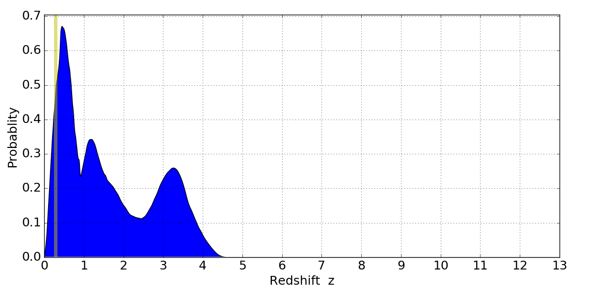 In P(z) plots: Yellow lines mark the cluster redshift z = 0.284,