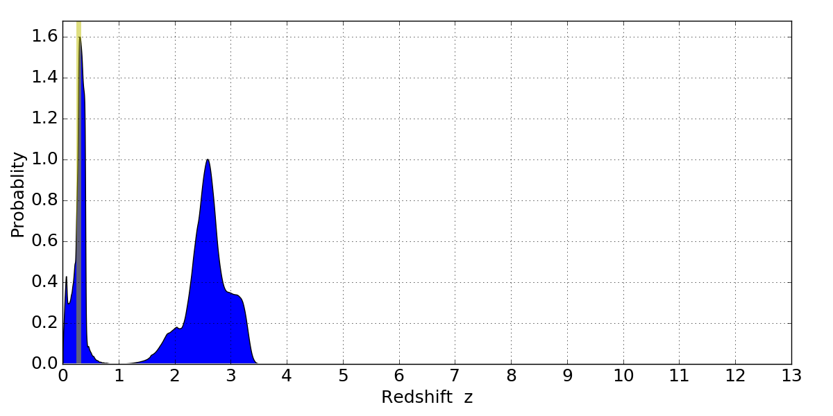 In P(z) plots: Yellow lines mark the cluster redshift z = 0.284,