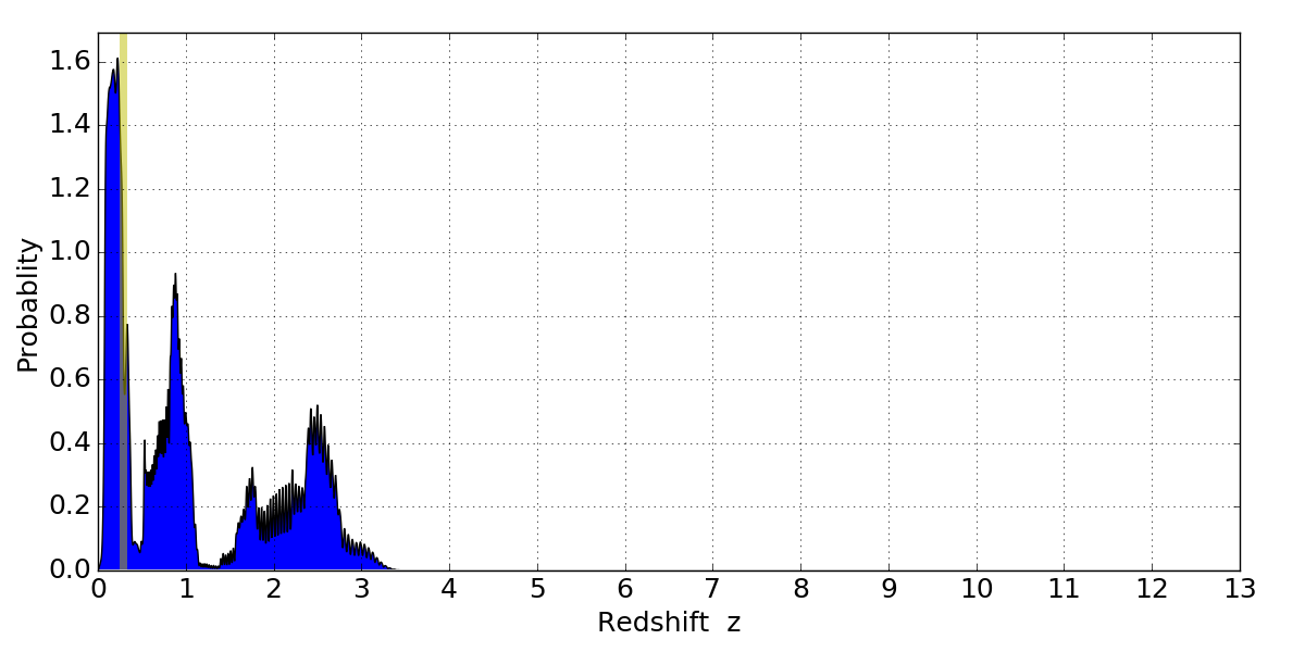 In P(z) plots: Yellow lines mark the cluster redshift z = 0.284,
