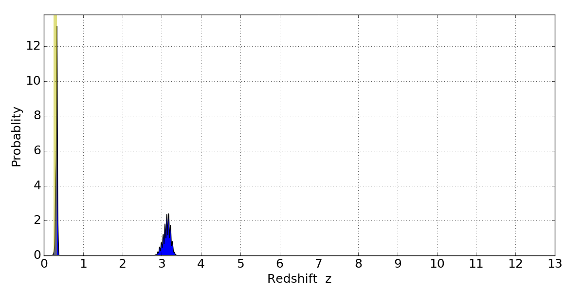 In P(z) plots: Yellow lines mark the cluster redshift z = 0.284,
