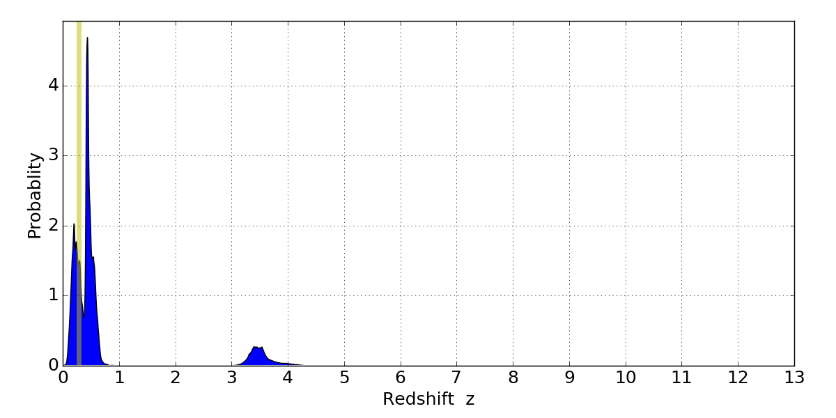 In P(z) plots: Yellow lines mark the cluster redshift z = 0.284,