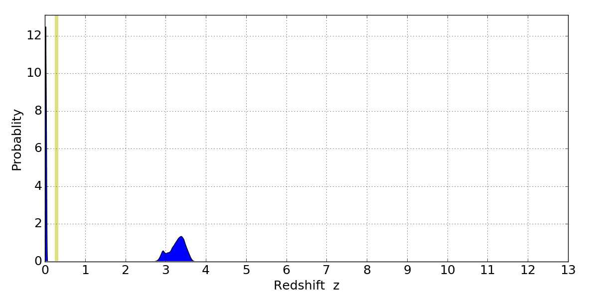In P(z) plots: Yellow lines mark the cluster redshift z = 0.284,