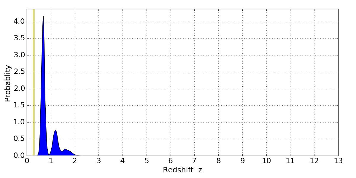 In P(z) plots: Yellow lines mark the cluster redshift z = 0.284,
