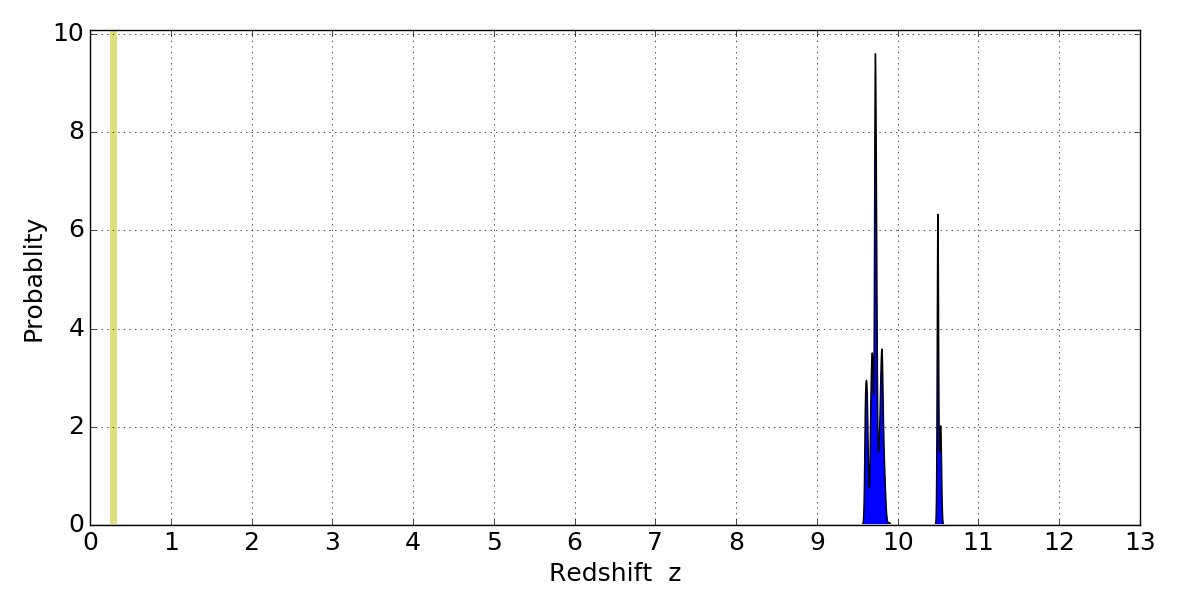 In P(z) plots: Yellow lines mark the cluster redshift z = 0.284,