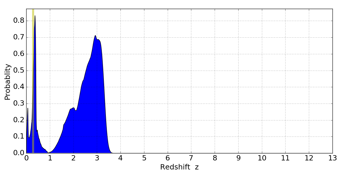 In P(z) plots: Yellow lines mark the cluster redshift z = 0.284,