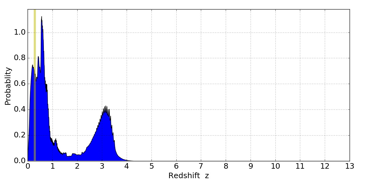 In P(z) plots: Yellow lines mark the cluster redshift z = 0.284,