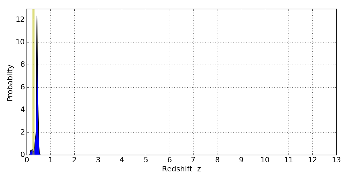 In P(z) plots: Yellow lines mark the cluster redshift z = 0.284,