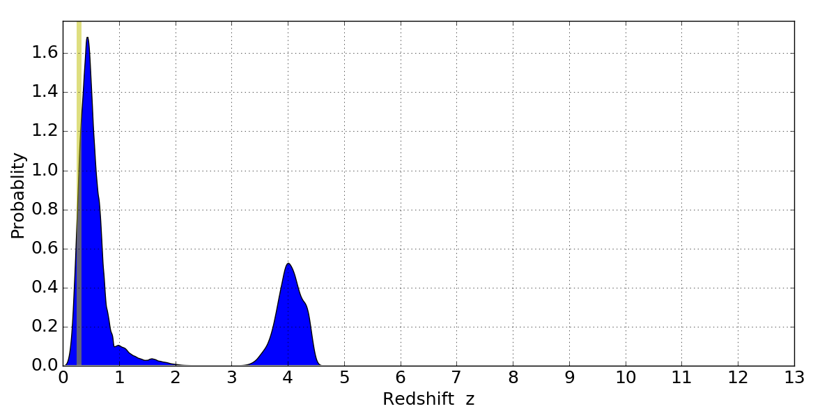 In P(z) plots: Yellow lines mark the cluster redshift z = 0.284,
