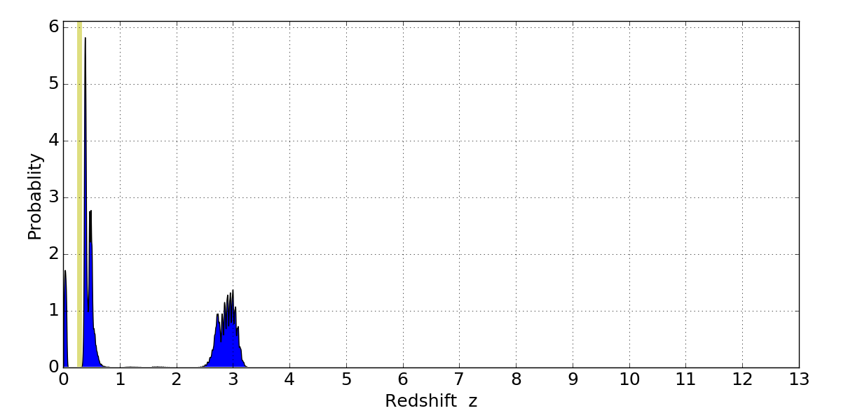 In P(z) plots: Yellow lines mark the cluster redshift z = 0.284,