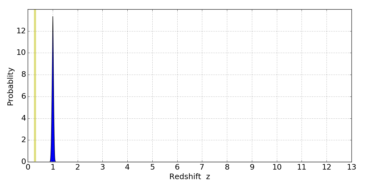 In P(z) plots: Yellow lines mark the cluster redshift z = 0.284,