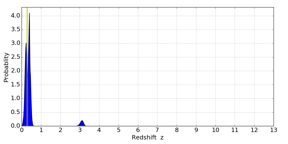 In P(z) plots: Yellow lines mark the cluster redshift z = 0.284,
