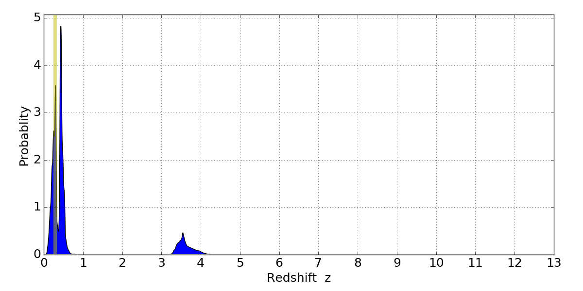 In P(z) plots: Yellow lines mark the cluster redshift z = 0.284,