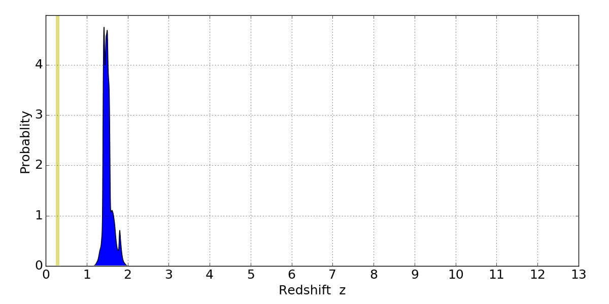 In P(z) plots: Yellow lines mark the cluster redshift z = 0.284,
