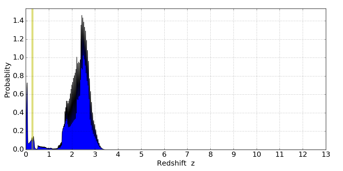 In P(z) plots: Yellow lines mark the cluster redshift z = 0.284,