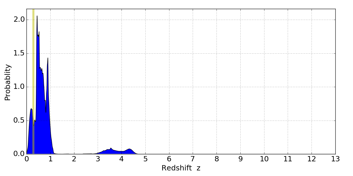 In P(z) plots: Yellow lines mark the cluster redshift z = 0.284,