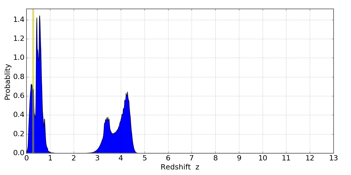 In P(z) plots: Yellow lines mark the cluster redshift z = 0.284,