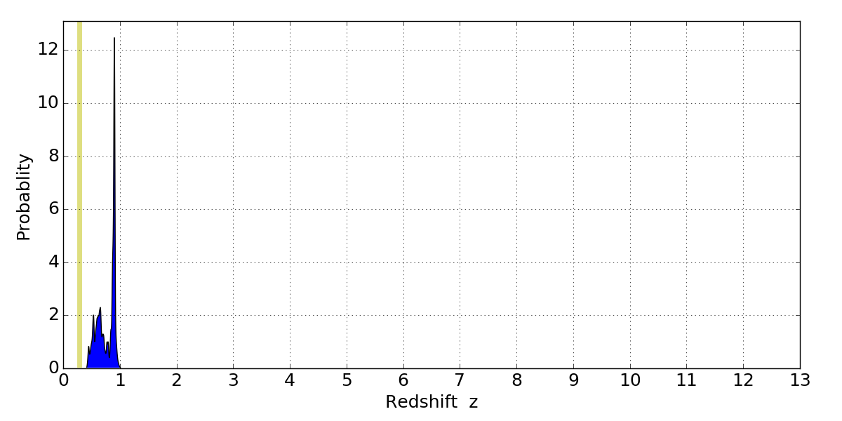 In P(z) plots: Yellow lines mark the cluster redshift z = 0.284,