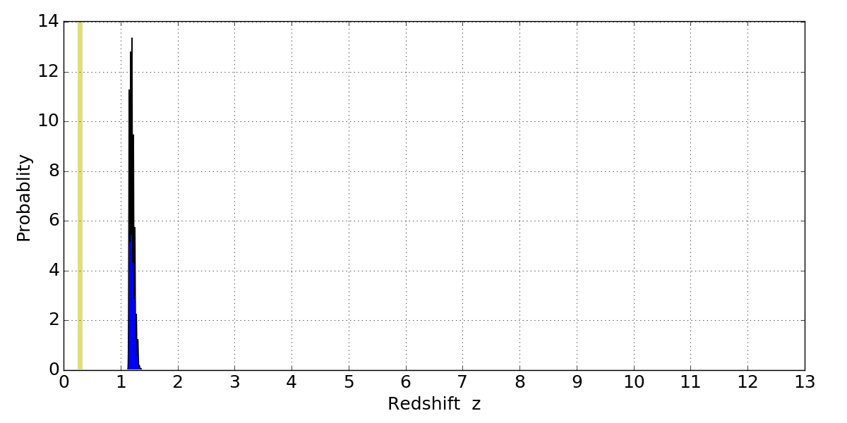 In P(z) plots: Yellow lines mark the cluster redshift z = 0.284,