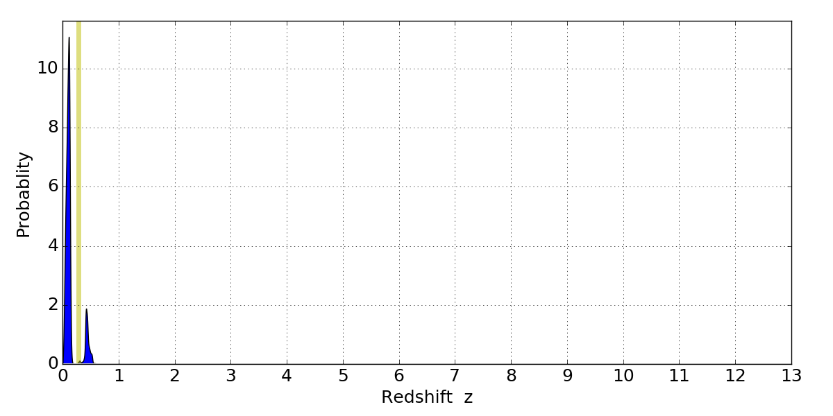 In P(z) plots: Yellow lines mark the cluster redshift z = 0.284,