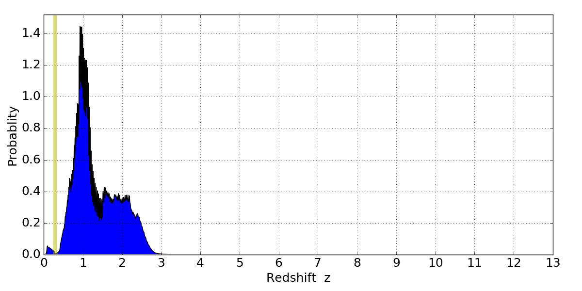 In P(z) plots: Yellow lines mark the cluster redshift z = 0.284,