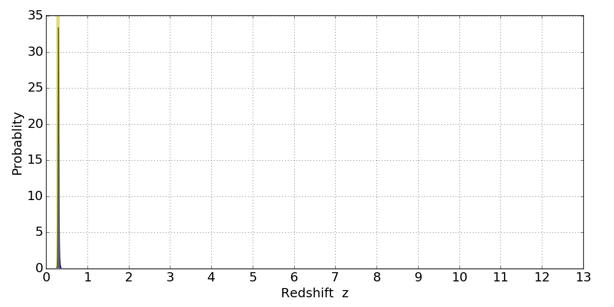 In P(z) plots: Yellow lines mark the cluster redshift z = 0.284,