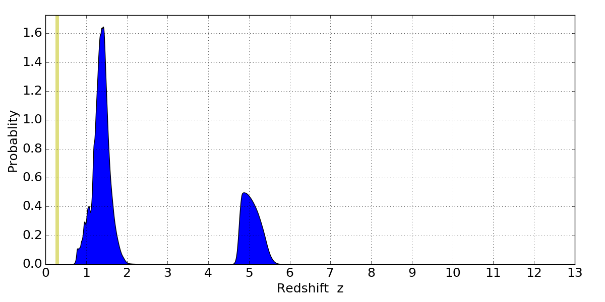 In P(z) plots: Yellow lines mark the cluster redshift z = 0.284,