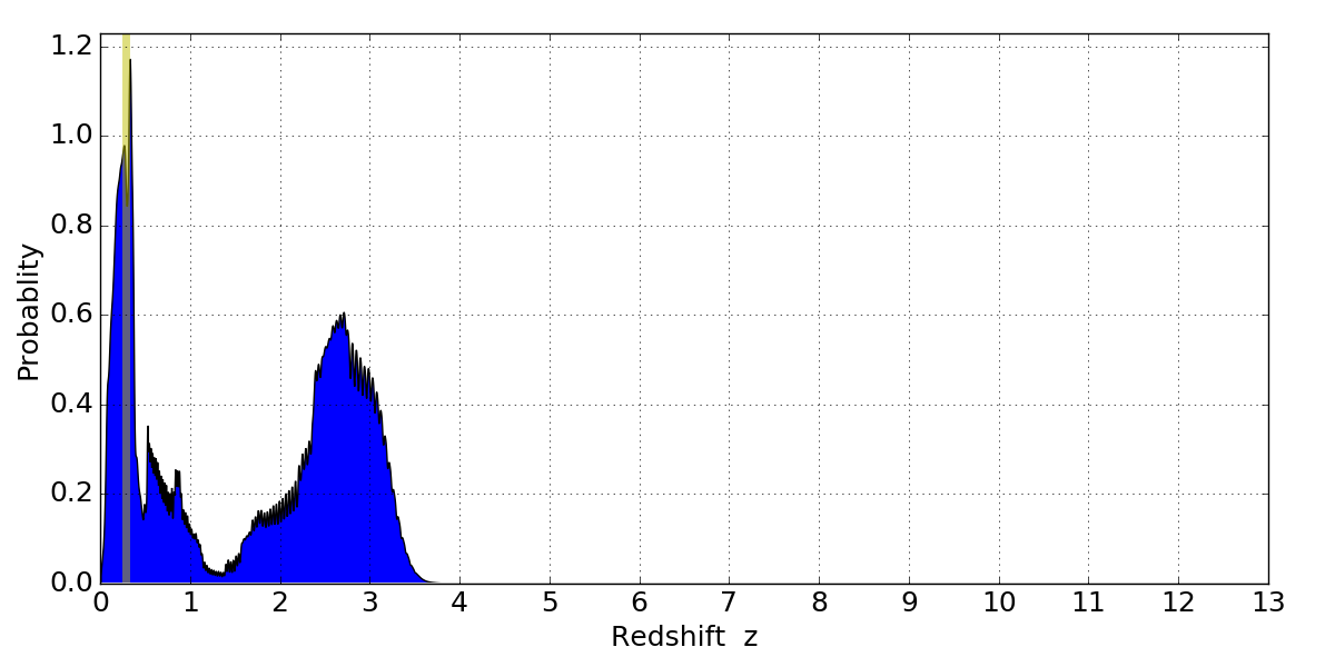 In P(z) plots: Yellow lines mark the cluster redshift z = 0.284,