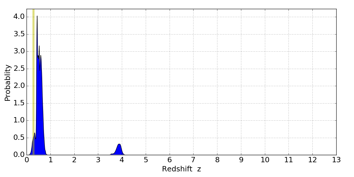 In P(z) plots: Yellow lines mark the cluster redshift z = 0.284,