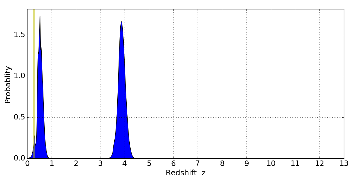 In P(z) plots: Yellow lines mark the cluster redshift z = 0.284,