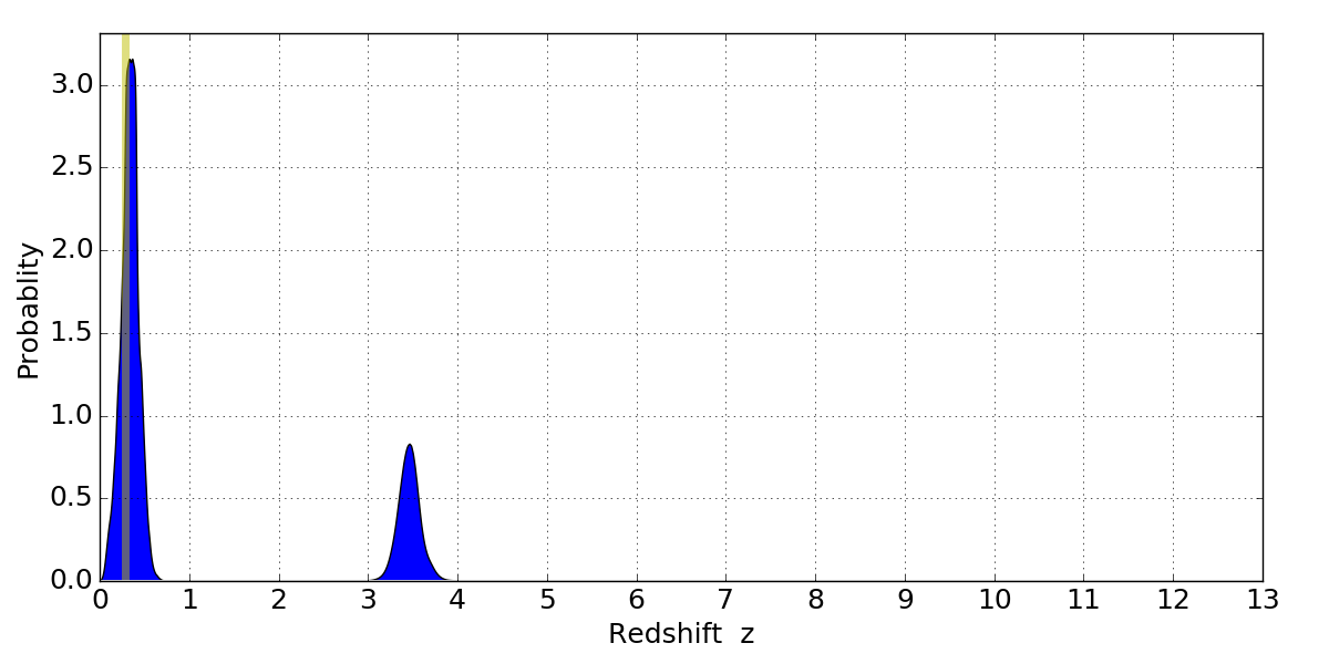 In P(z) plots: Yellow lines mark the cluster redshift z = 0.284,