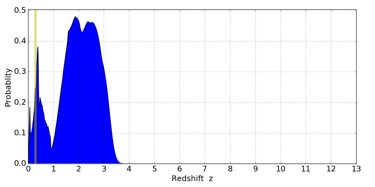 In P(z) plots: Yellow lines mark the cluster redshift z = 0.284,