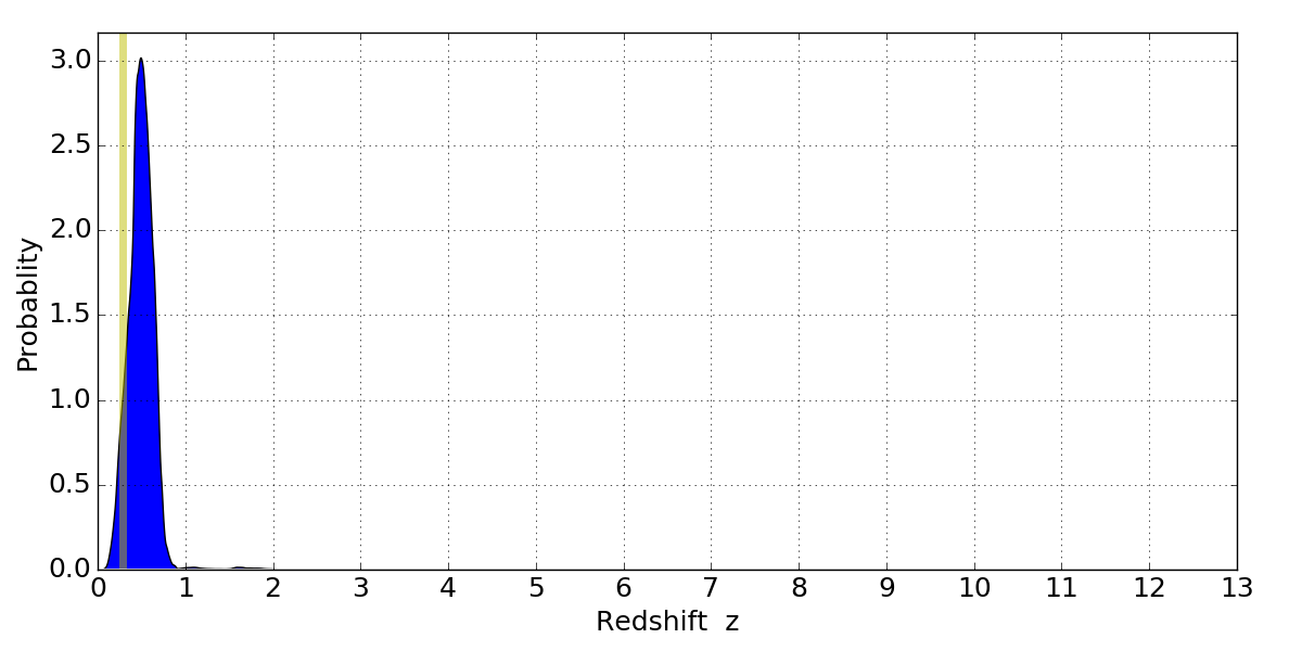 In P(z) plots: Yellow lines mark the cluster redshift z = 0.284,