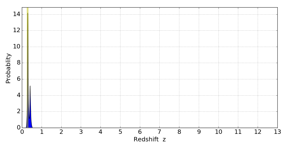 In P(z) plots: Yellow lines mark the cluster redshift z = 0.284,