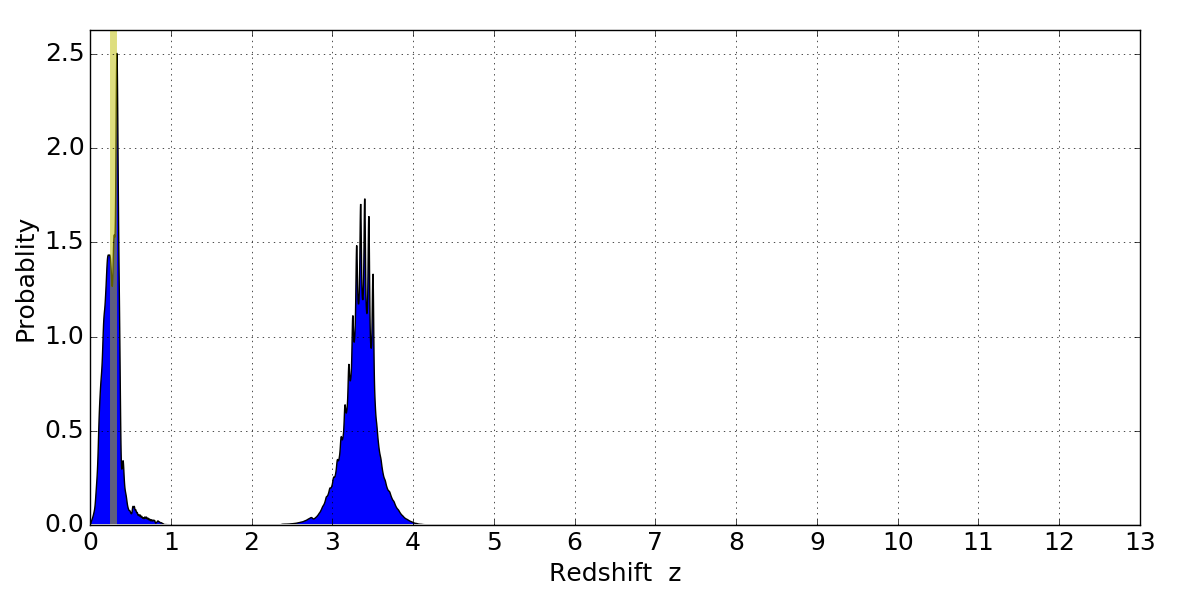 In P(z) plots: Yellow lines mark the cluster redshift z = 0.284,