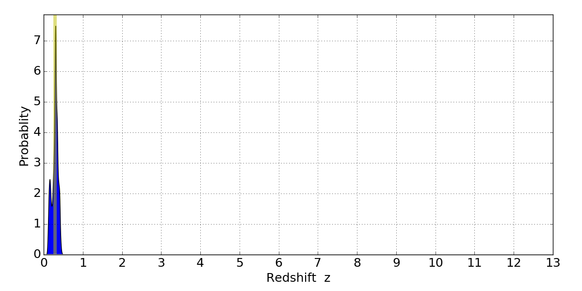 In P(z) plots: Yellow lines mark the cluster redshift z = 0.284,
