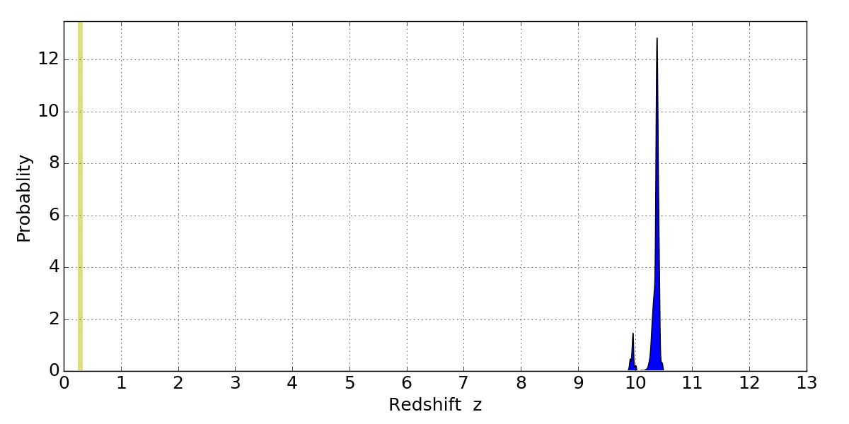 In P(z) plots: Yellow lines mark the cluster redshift z = 0.284,