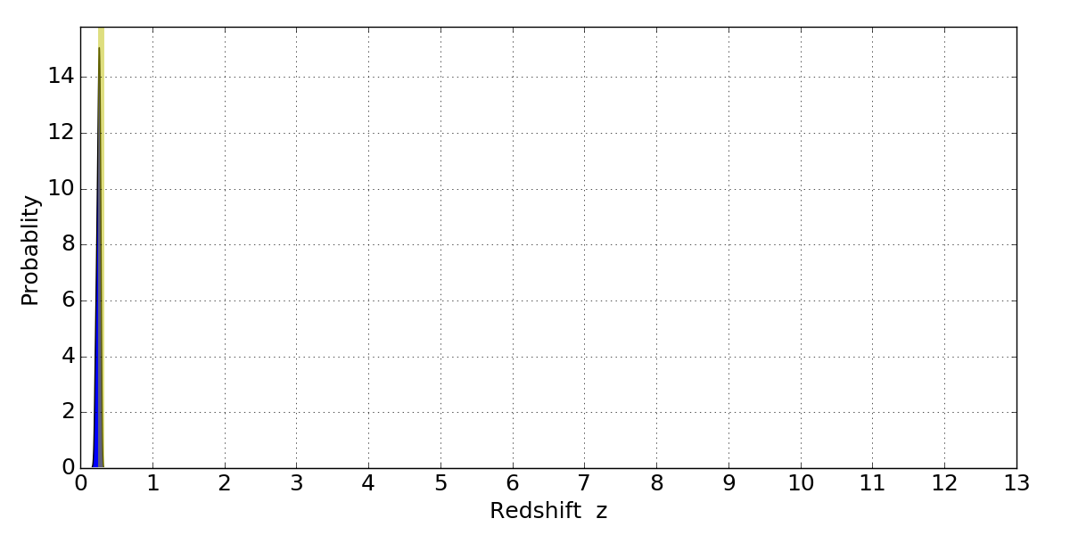 In P(z) plots: Yellow lines mark the cluster redshift z = 0.284,