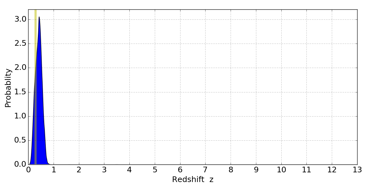 In P(z) plots: Yellow lines mark the cluster redshift z = 0.284,