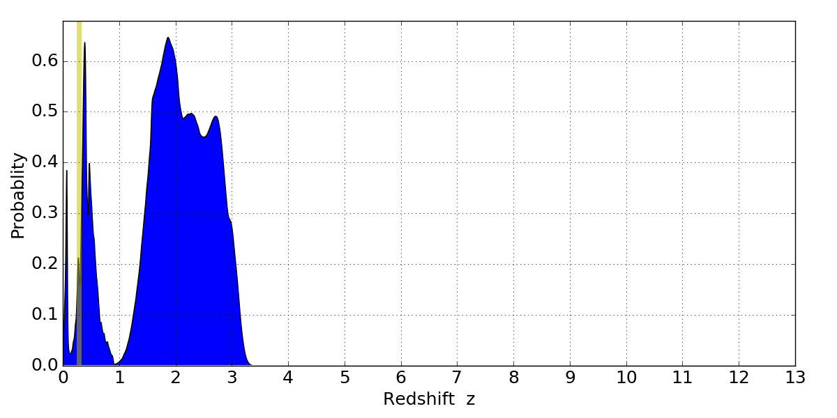 In P(z) plots: Yellow lines mark the cluster redshift z = 0.284,