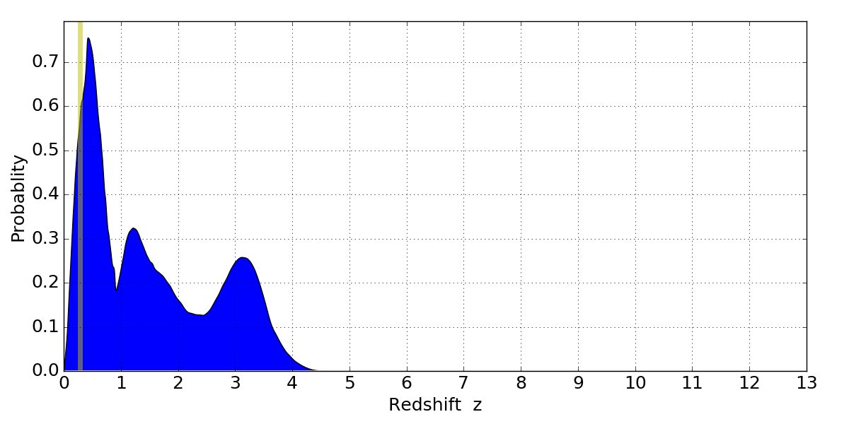 In P(z) plots: Yellow lines mark the cluster redshift z = 0.284,