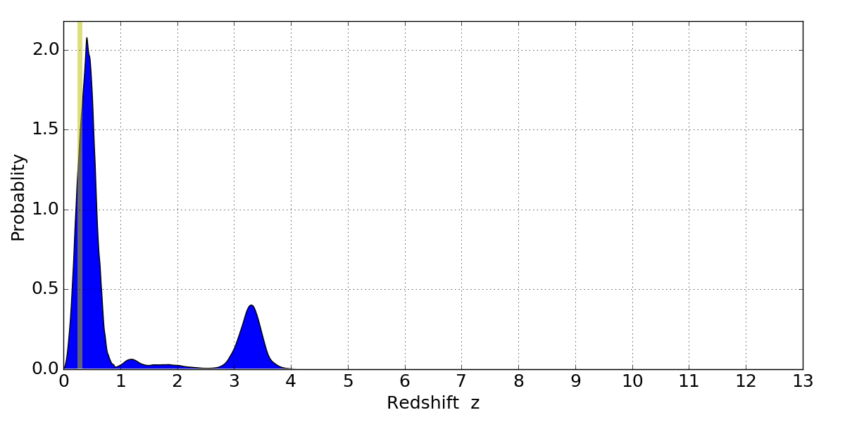In P(z) plots: Yellow lines mark the cluster redshift z = 0.284,