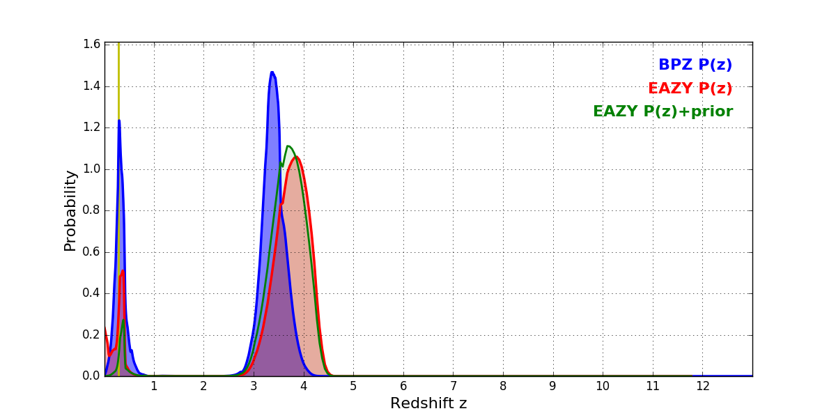 In P(z) plots: Yellow lines mark the cluster redshift z = 0.284,