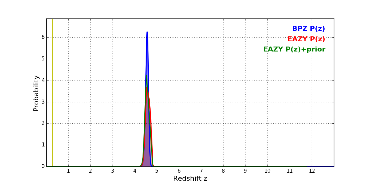 In P(z) plots: Yellow lines mark the cluster redshift z = 0.284,