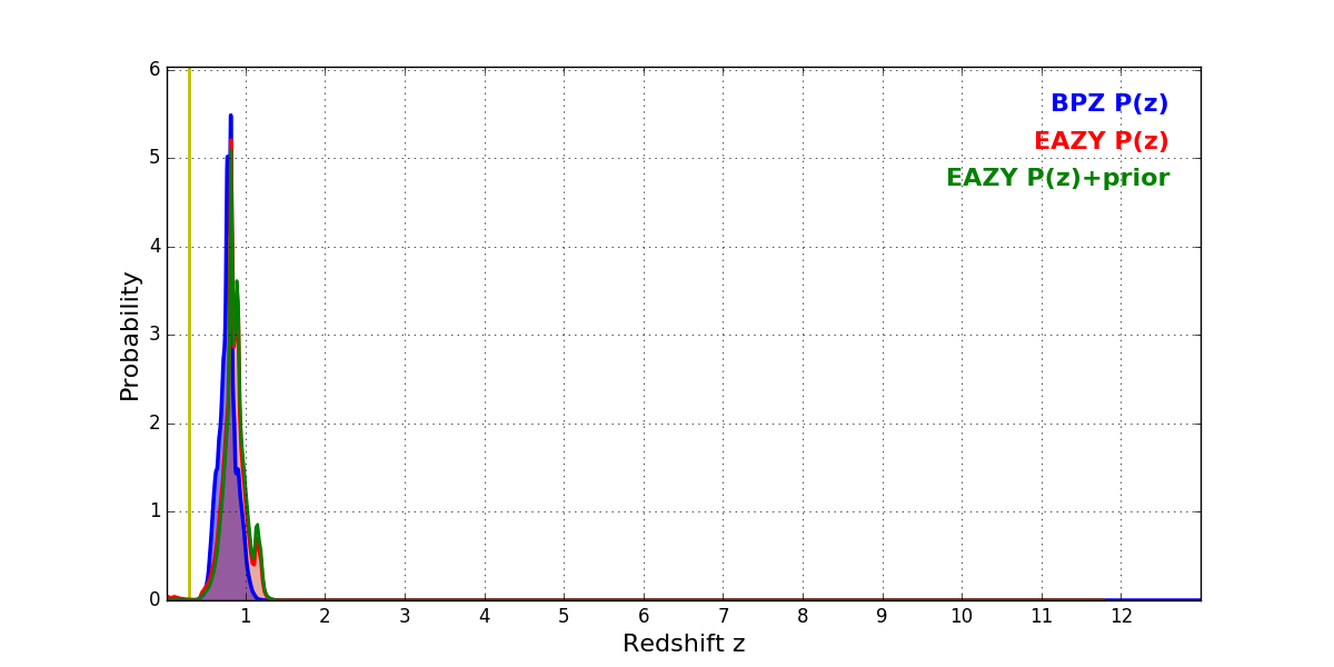 In P(z) plots: Yellow lines mark the cluster redshift z = 0.284,