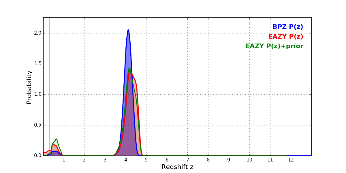 In P(z) plots: Yellow lines mark the cluster redshift z = 0.284,